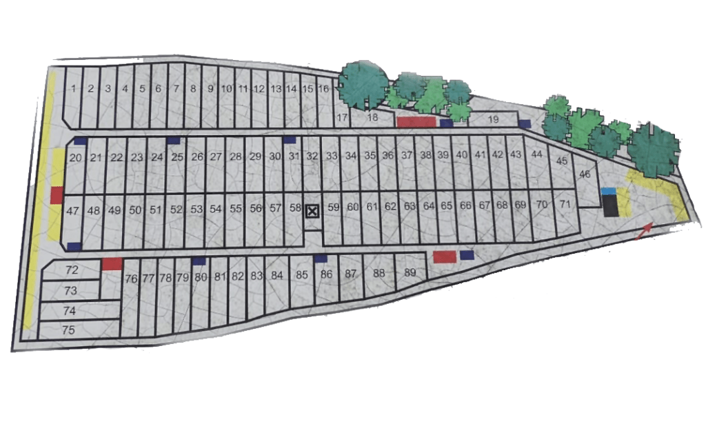 The site comprises of a single field of 89 plots, a trading hut (marked in blue) and a small car park at the front and back end (marked in yellow). There is a single entrance with a common gate at the east side.